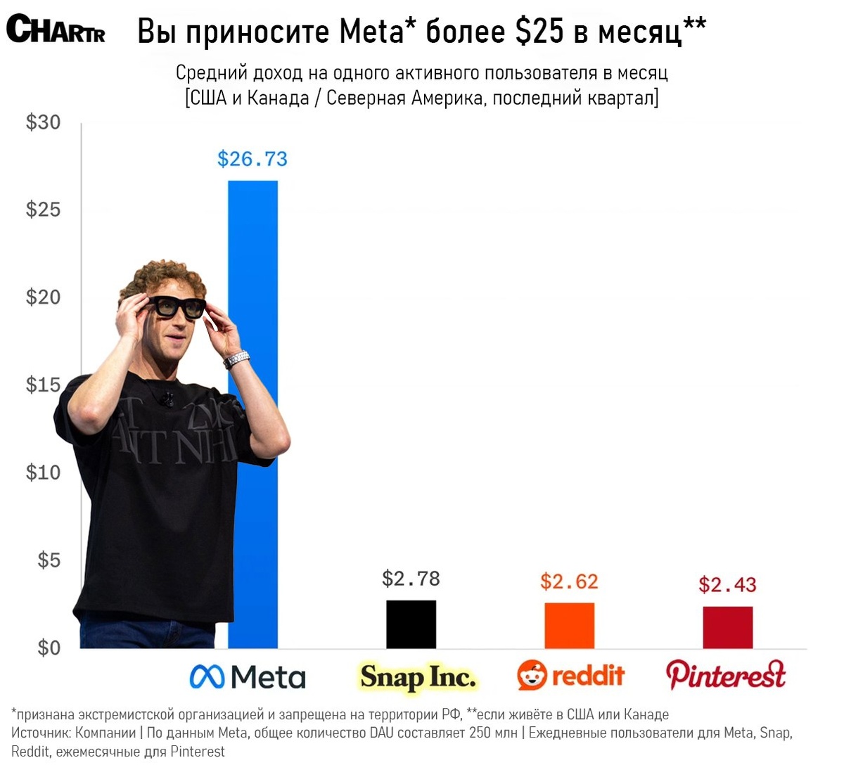 ! Социальные сети представляют собой рынок внимания. Пользователь заходит бесплатно, но платит временем и данными. Большинство соцсетей зарабатывают на одном пользователе в США около $2–3 в месяц. Reddit и Snap находятся примерно в этих же рамках. А вот Meta* играет в другой лиге. Facebook и Instagram приносят компании около $25–27 с пользователя. Разница почти в 10 раз. Феноменально. Почему? Первый фактор. Meta продаёт не показы, а поведение. Платформа годами собирает данные о пользователе: интересы, покупки, реакции, время в ленте. У них лучший алгоритм на рынке. Кто делал там рекламу, не даст соврать. Это даёт рекламодателю точный таргет и высокую конверсию, и очень простую настройку. Поэтому реклама у Meta дороже и эффективнее. Второй фактор. Масштаб. Миллиарды пользователей. Один рекламный кабинет закрывает большую часть рынка. Третий фактор. Удержание. Алгоритмы Meta заточены на максимальное время в приложении. Чтобы дать пользователю то, что он хочет, то есть залипашечку.