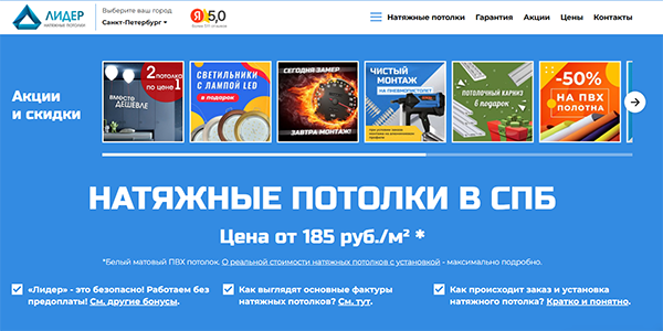 Один из признанных лидеров рынка СПб с более чем 15-летним опытом работы. «Лидер» — надежный и ориентированный на клиента подрядчик, предлагающий качественные натяжные потолки по разумным ценам и без предоплаты: клиент оплачивает заказ только после завершения монтажа и приемки результата. Специалисты фирмы выполняют работы разной сложности — от классических ПВХ-потолков до сложных дизайнерских конструкций, в том числе на коммерческих объектах. Для удобства клиентов на сайте есть онлайн-калькулятор для точного расчета стоимости монтажа без лишних звонков. «Лидер» ценят за большое портфолио готовых объектов, подтверждающее опыт и профессионализм, оперативный монтаж от одного дня, длительную гарантию до 15 лет. Эти преимущества дают компанию одной из лучших в Санкт-Петербурге.