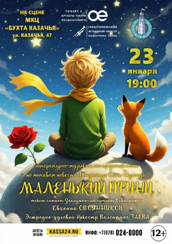» В концертном зале Многофункционального культурного центра «Бухта Казачья» состоится поистине завораживающее и волшебное действо. Актер театра и кино Заслуженный артист Севастополя Евгений Овсянников представит одно из самых глубоких произведений литературы, сказку Антуана де Сент-Экзюпери "Маленький принц" — притчу для всех возрастов. Аккомпанировать рассказчику будет Севастопольский эстрадно-духовой оркестр под управлением Заслуженного артиста Севастополя Валентина Таева. В обработке для духового оркестра прозвучат произведения французских романтиков - Камиля Сен-Санса, Мориса Равеля и Клода Дебюсси. 👉 Когда? 23 января в 19:00 👉 Где? Севастополь, Многофункциональный культурный центр Бухта Казачья ✨Давай сходим, Севастополь | Читайте и смотрите нас в МАХ