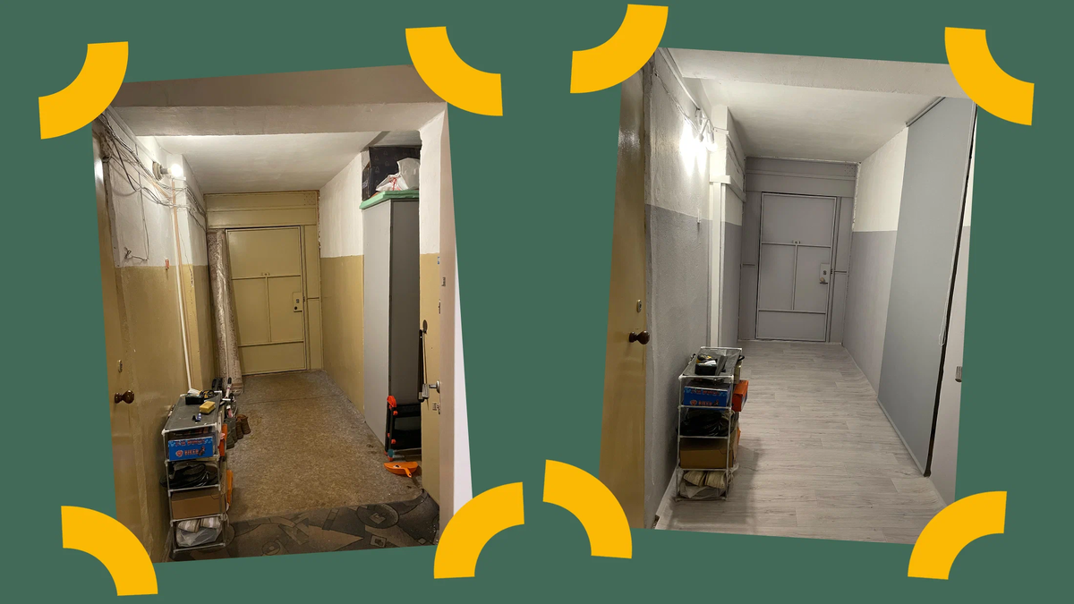 И вот осенью 2023-го звёзды сошлись — всё началось с того, что меня затопили жильцы сверху. У них прорвало батарею, когда включили отопление, поэтому вся моя квартира была в воде. Пришлось ввязаться в новый ремонт, менять разбухший ламинат, наличники дверей и решать кучу других вопросов. И я подумала: раз уж этим занимаюсь, почему бы не привести в порядок ещё и коридор в подъезде!