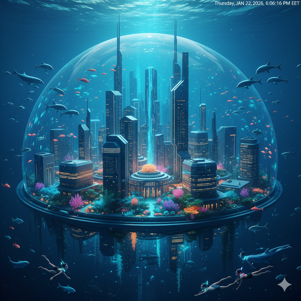 Мы привыкли смотреть на океан как на бескрайнюю и опасную стихию, пригодную лишь для коротких погружений. Но что, если дефицит суши и жажда приключений заставят нас спуститься глубже? Эпоха тесных мегаполисов на поверхности земли сменяется эрой величественных городов под куполами. И глазом не успеете моргнуть, как ваш адрес сменится с «улицы Ленина» на «Коралловый риф, блок 5». Как это работает? Мы входим в эпоху гидробионической колонизации и глубоководной инженерии. Немного юмора Главный курьез будущего — это «подводные курьеры». Вы заказываете пиццу, а она задерживается, потому что доставщик на скутере попал в «пробку» из мигрирующих скатов или его перехватил слишком любопытный осьминог, решивший, что коробка — это новый вид жилья. И глазом не успеете моргнуть, как появятся новые бытовые жалобы: «Дорогой, опять соседи сверху развели стаю неоновых рыб, они всю ночь светят нам в спальню через иллюминатор!» В чем главная интрига? Сможем ли мы адаптироваться к давлению бездны не только