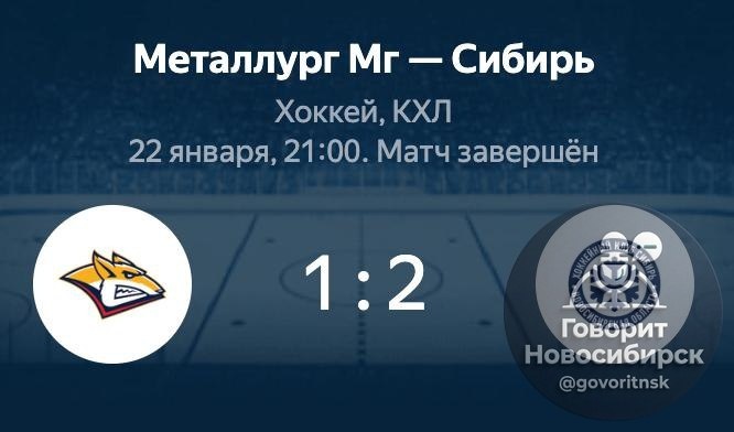 ❄️🦊 ХК «Сибирь» одержал победу над магнитогорским «Металлургом» в гостях на регулярном чемпионате КХЛ со счётом 2:1