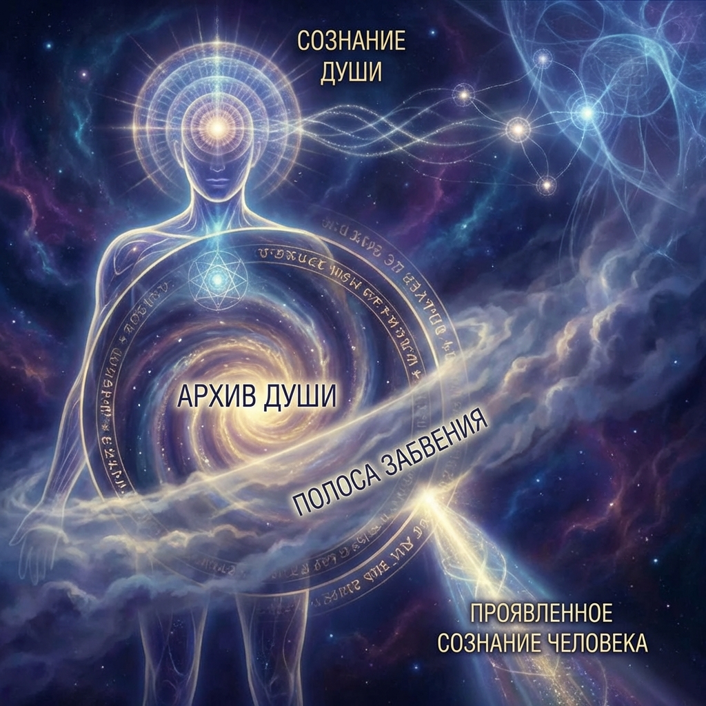 Когда на графическом рисунке мы рассматриваем структуру души, то видим там сектор, называемый «Архив души» – это и есть резервуар её памяти. В нём собрана и хранится информация обо всех воплощениях души в физическом мире и всех её периодах между воплощениями. Именно к этому элементу души относится то, что мы называем «полоса забвения». То есть, при очередном воплощении души, с уровнем сегодняшнего проявленного сознания человека, этот «архив», как правило, закрывается.