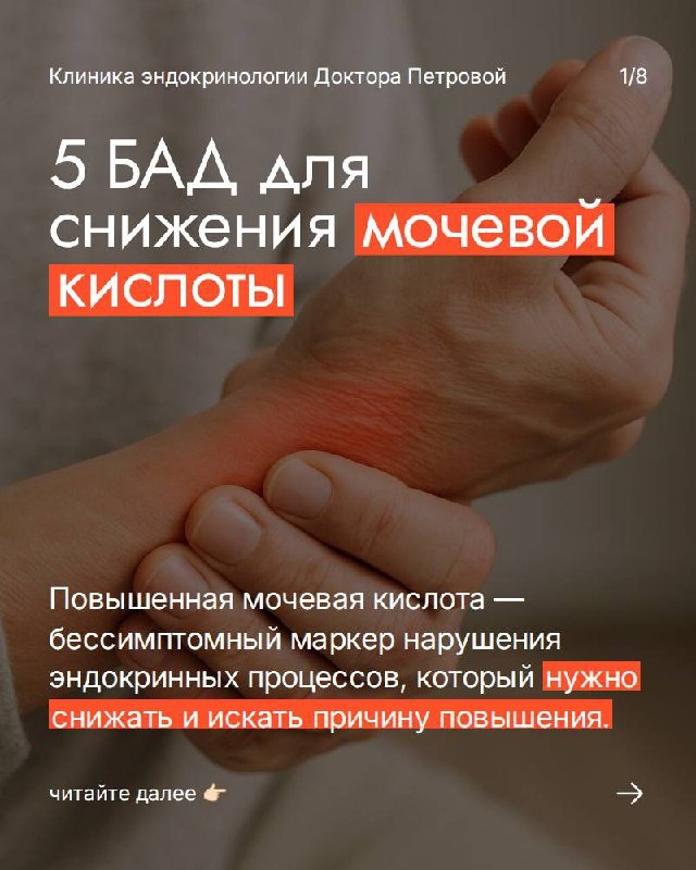 Повышенный уровень мочевой кислоты является прямым путем к развитию подагры и усугубляет сердечно-сосудистые риски. 👉Хотя основой лечения всегда является коррекция образа жизни, диета и, при необходимости, медикаментозная терапия, некоторые биологически активные добавки могут стать ценным дополнением к вашей стратегии управления здоровьем. Читайте подробнее в картинках ✅