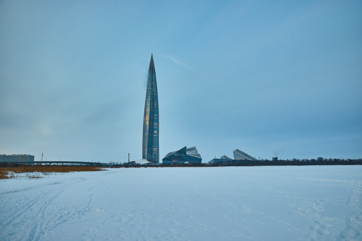 : Вот такой открывается вид на небоскрёб «Лахта Центр» со стороны озера Лахтинский Разлив. Съёмка от 25 февраля 2025 года. Фотограф: Филипп Лепцов #лахтацентр #фото 😊 Небоскрёбы России