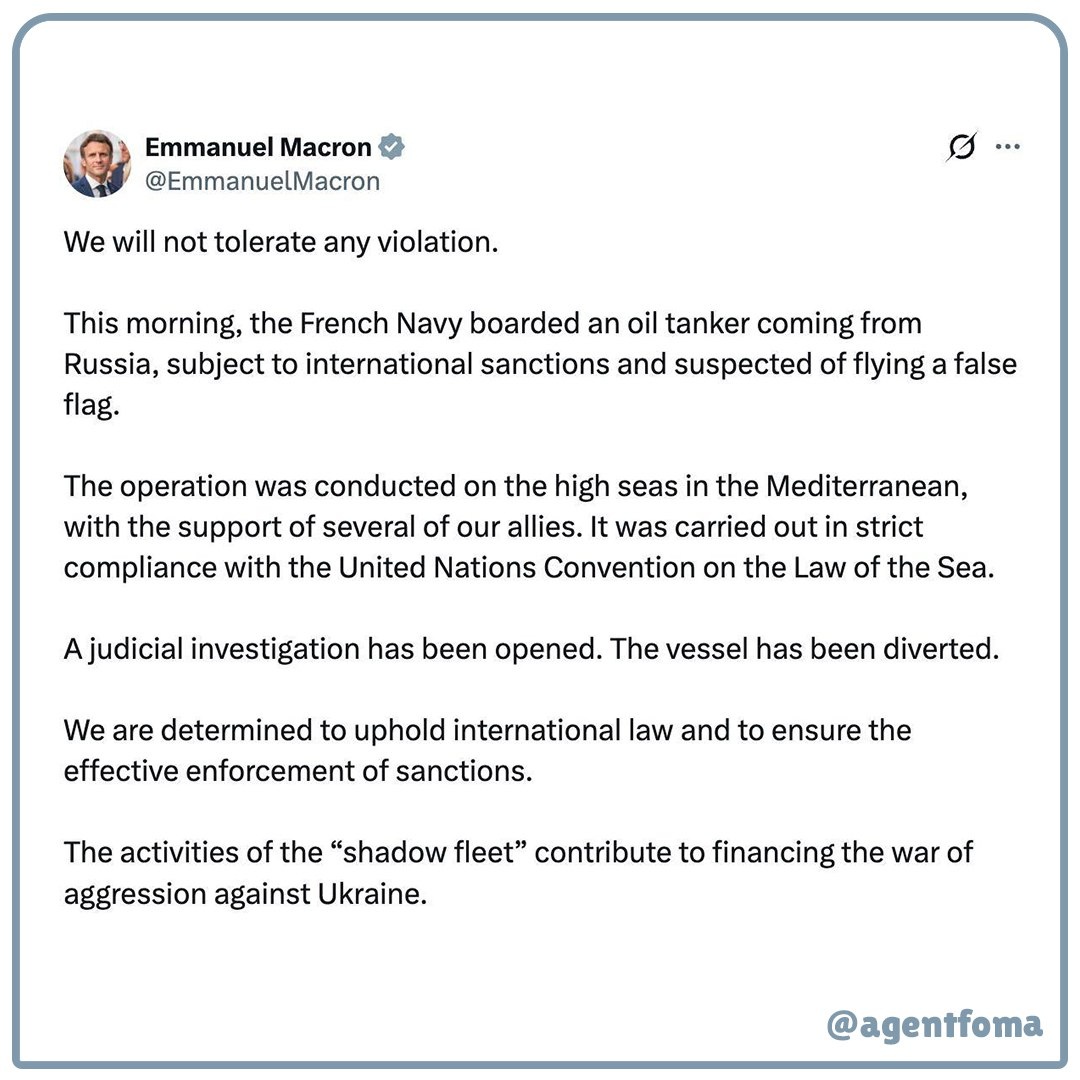 Мы не потерпим никаких нарушений. 🔘Сегодня утром военно-морские силы Франции взяли на абордаж нефтяной танкер, следовавший из России, на который распространяются международные санкции и который подозревается в использовании чужого флага. 🔘Операция проводилась в открытом море в Средиземном море при поддержке нескольких наших союзников. Она проводилась в строгом соответствии с Конвенцией Организации Объединенных Наций по морскому праву. 🔘Начато судебное расследование. Судно было перенаправлено. 🔘Мы полны решимости соблюдать международное право и обеспечивать эффективное применение санкций. 🔘Деятельность "теневого флота" способствует финансированию агрессивной войны против Украины. Что этот поверивший в себя "лягушатник" себе позволяет!? Зовите Брижит! 👀 @agentfoma собирает новости от других агентов по всему миру... Подписывайтесь, чтобы не потерять!