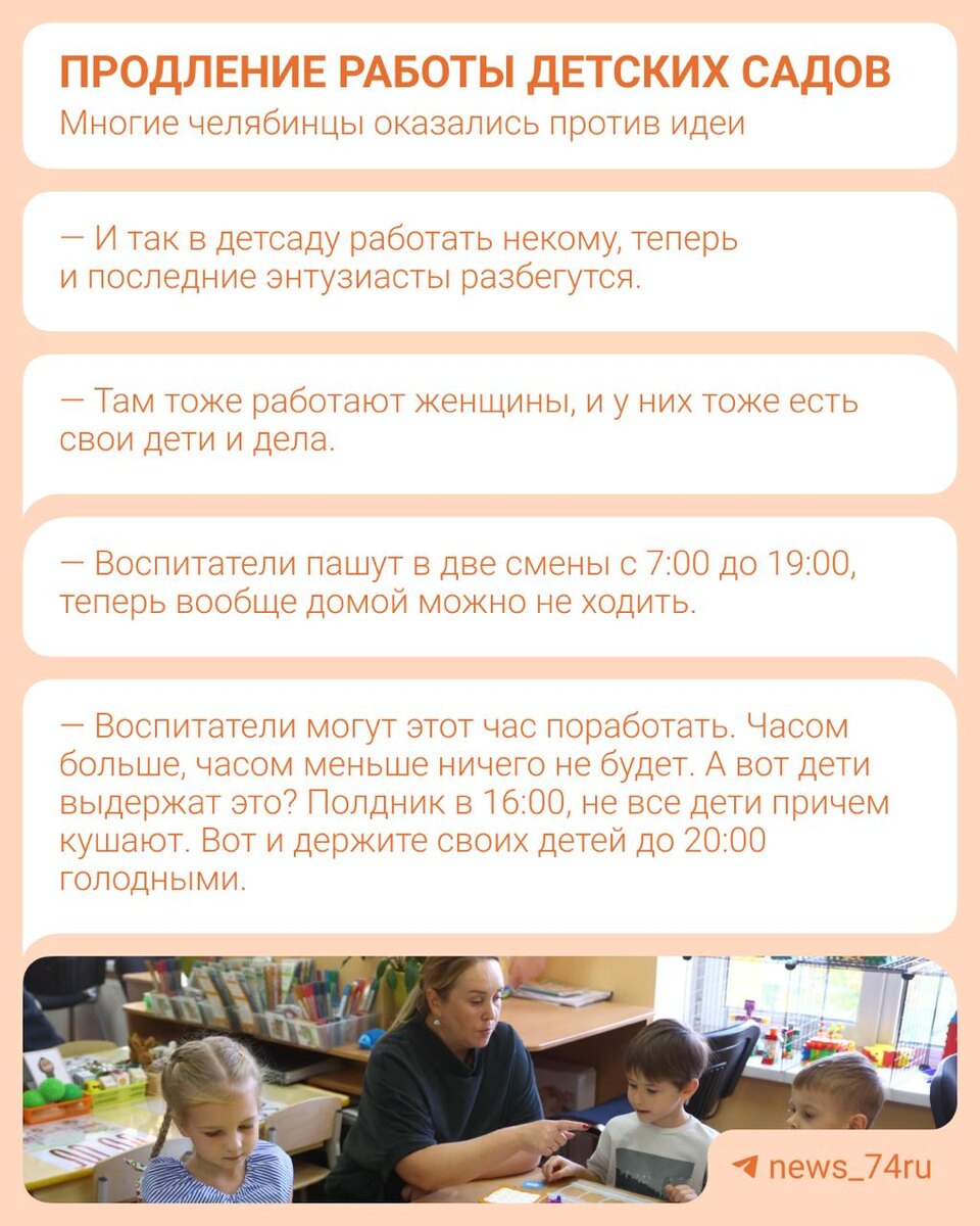 Как челябинцы отреагировали на продление работы детских садов В комментариях жарко. Одни радуются: наконец-то можно спокойно работать допоздна. Другие спорят, до какого часа вообще нормально задерживаться воспитателям. Самые яркие реакции — в карточках ⬆️ К слову, в Госдуме тоже спорят на эту тему. Лидер партии «Справедливая Россия» считает, что продлевать работу детсадов просто так нельзя. По его мнению, для этого нужны дополнительные ставки и ощутимый рост зарплат — минимум в полтора-два раза. Согласны с таким мнением? 👍/👎