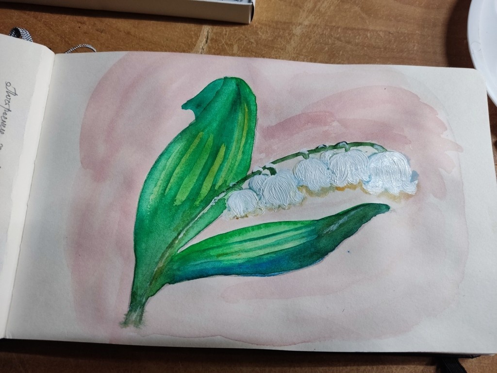 В этот день я нарисовала ландыш и желуди. Покажу, что у меня получилось и что не получилось. И почему получилось, и почему что-то не получилось... Смешно... Но каждый раз я узнаю что-то новое, о чем прежде мне и в голову бы подумать не пришло. Ну мы же помним, что я решила поработать акварелью. Причем, поучиться у мастеров. Поскольку на планшете стилусом и карандашами я рисую прекрасно. Простите за нескромность. Ха-ха... Читайте также: Как рисовать на планшете: урок 1 (Программа, цвет и фон) (д) К примеру, вот какой у меня был рисунок ландыша в цифровом редакторе, где огромное количество цветов и оттенков: Но акварелью рисовать нужно умеючи. Внезапно оказалось, что в моих наборах акварельных красок вовсе нет белого цвета. Потому что в акварели подразумевается, что вместо белого цвета выступает лист бумаги сам. Или если рисуешь очень темное место, то можно имитировать снег, разбрызгивая белила. Или гуашь. То есть, белый лист и на нем темное небо. Например. То просто брызгают белили, пос