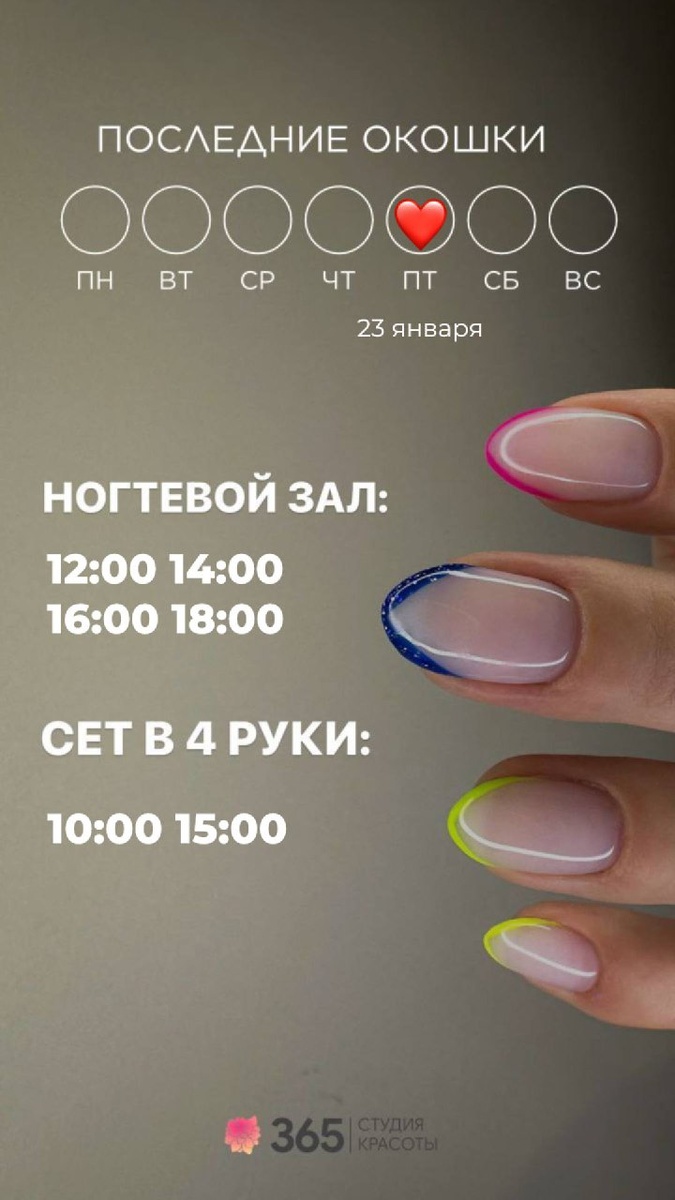 ❤ Уверены, проведённое у нас время оставляет только приятные впечатления и дарит отличное настроение на весь уикенд 🤗😍❤ Будем рады видеть Вас снова 🥰 #красота #наслаждение #забота #зима #любовь #мечты сбываются #радость #возможности ЧТО МОЖНО УСПЕТЬ СДЕЛАТЬ 23 января 2026 года : Ногтевой зал: 12:00 14:00 16:00 18:00 Сет в 4 руки: 10:00 15:00 Парикмахерский зал: 12:00 15:00 Оформление бровей и ресниц: ближайшая запись на 24 января Косметология/шугаринг: 11:00 15:30 18:00 20:00 ЗАПИСАТЬСЯ МОЖНО ЛЮБЫМ УДОБНЫМ СПОСОБОМ: 👉🏻 Сообщение в Whats'app https://wa.me/79663654477 👉🏻По телефону +79663654477 👉🏻Онлайн запись https://n286444.yclients.com/ #команда365 #красота #наслаждение #забота #зима #январь #любовь #мечтысбываются #радость #возможности
