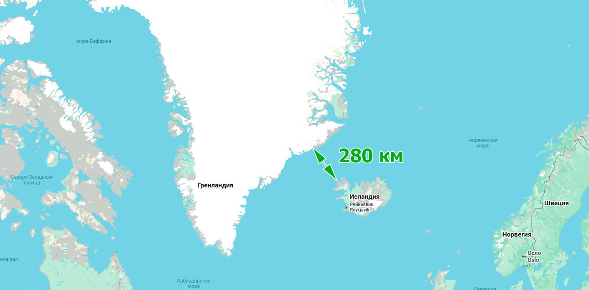 Итак, наименьшее расстояние между Исландией и Гренландией по прямой примерно 280 км, если верить гугл картам.