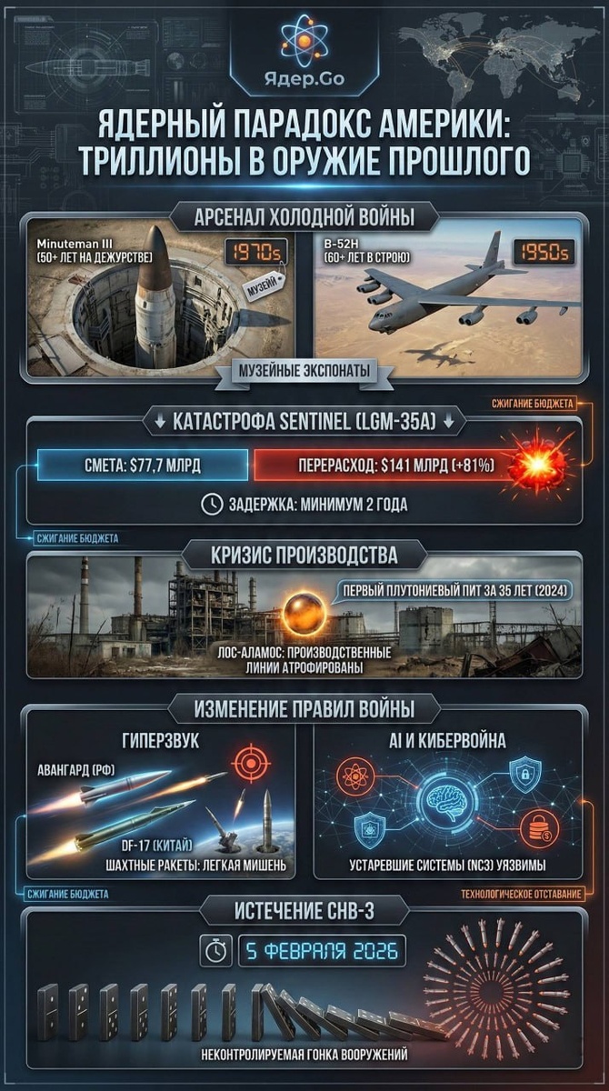 Стратегический ядерный арсенал США в глубоком кризисе. Вашингтон угодил в классическую «ловушку модернизации»: колоссальные бюджеты сгорают в попытках обновить наследие холодной войны, но технологическое отставание только растет. Основа ядерной триады США — это буквально музейные экспонаты: 🚀 Minuteman III: На боевом дежурстве уже более 50 лет. ✈️ B-52H: В строю уже более 60 лет (дольше, чем живут многие их пилоты). Программа новой ракеты Sentinel (LGM-35A), призванная их заменить, стала символом управленческой катастрофы Пентагона. • Цена ошибки: Смета взлетела с $77,7 млрд до $141 млрд (+81% перерасхода). • Срыв сроков: Развертывание отложено минимум на 2 года. В 2024 году США помпезно отчитались о производстве первого за 35 лет плутониевого пита (ядра боеголовки). Но этот «успех» лишь подсветил масштаб деградации: производственные линии Лос-Аламоса атрофированы и физически не способны выдержать график перевооружения. Пока США заливают деньгами «железо», правила войны изменились