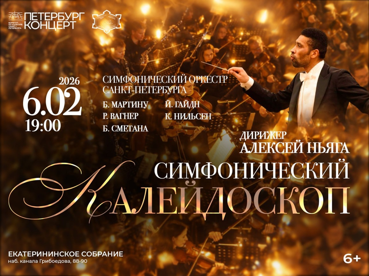 — 6 февраля в Екатерининском собрании! В программе вас ждет симфония «Королева» (Йозеф Гайдн), посвященная Марии-Антуанетте, симфоническая поэма «Влтава», воспевающая красоту чешской природы (Бедржих Сметана), сочинение для симфонического оркестра «Зигфрид-идиллия», вдохновленное сказаниями германо-скандинавской мифологии (Рихард Вагнер), концертная увертюра «Гелиос», вдохновленная восходами и закатами Эгейского моря (Карл Нильсен) и редкая гостья концертных залов — Концертная увертюра №345 (Богуслав Мартину). Исполнители: Симфонический оркестр Санкт-Петербурга (художественный руководитель и главный дирижер — Сергей Стадлер) Дирижер: Алексей Ньяга *Зрителей, которые приобретут билеты с 1 по 5 ряд на данное событие, в 17:30 будет ждать бесплатная экскурсия по Екатерининскому собранию. БИЛЕТЫ: 6.02 | 19:00 | Симфонический калейдоскоп