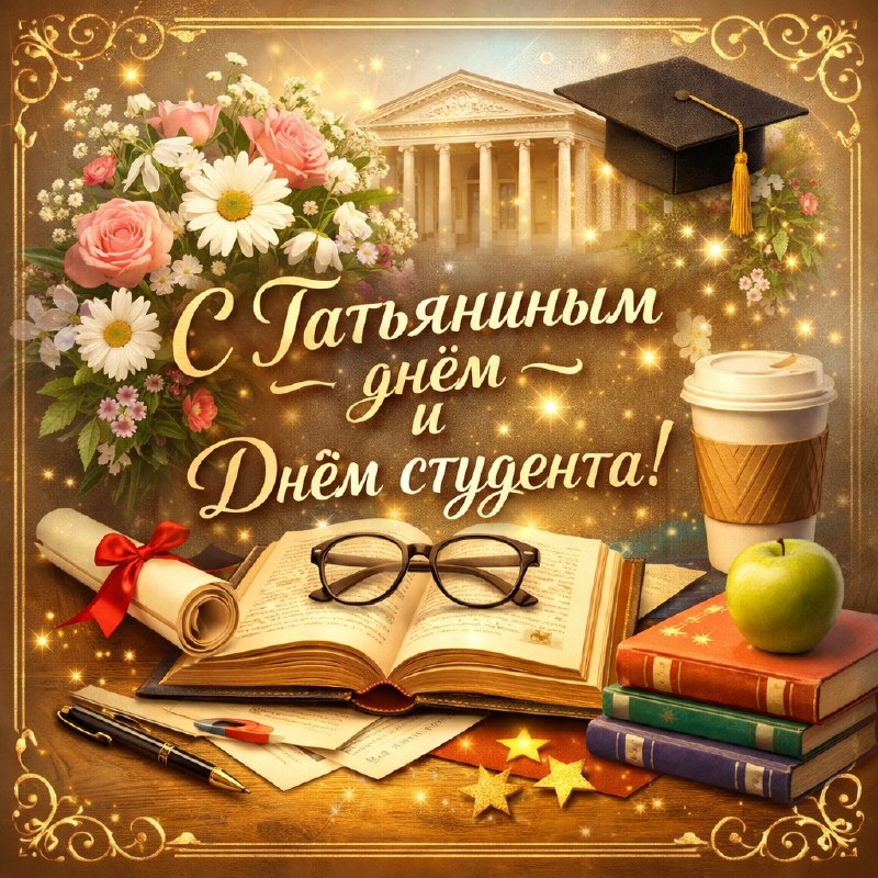 Дорогая Татьяна, сегодня два повода для радости: чествование твоего прекрасного имени и праздник всех, кто учится и познаёт мир. Пусть этот день напомнит тебе о самом ценном: о дружбе, которая крепка, как студенческая, о вере, которая сильна, как у святой, и о любви, которая делает жизнь прекрасной.