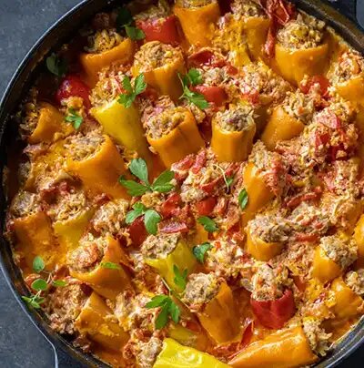 Эти фаршированные мини-перцы наполнены пикантной начинкой из мясного фарша и риса, а затем запекаются в сливочно-томатном соусе. Это овощное блюдо можно приготовить на ужин. Блюдо получается очень вкусным. Обязательно попробуйте его приготовить. Вот рецепт фаршированных перцев в соусе. Для приготовления нам будут нужны вот эти продукты: