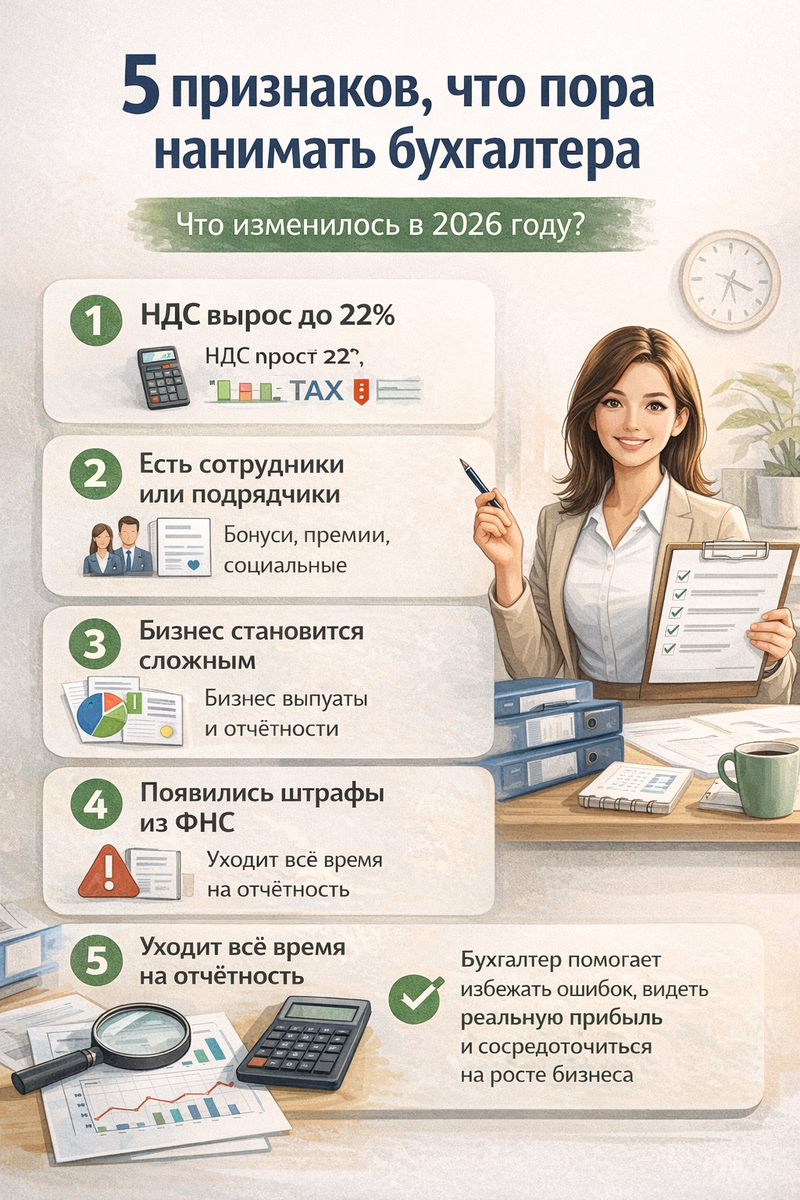 Бухгалтер — это не роскошь, это страховка вашего бизнеса, особенно после изменений вступивших в силу 01.01.2026 года. Он помогает: