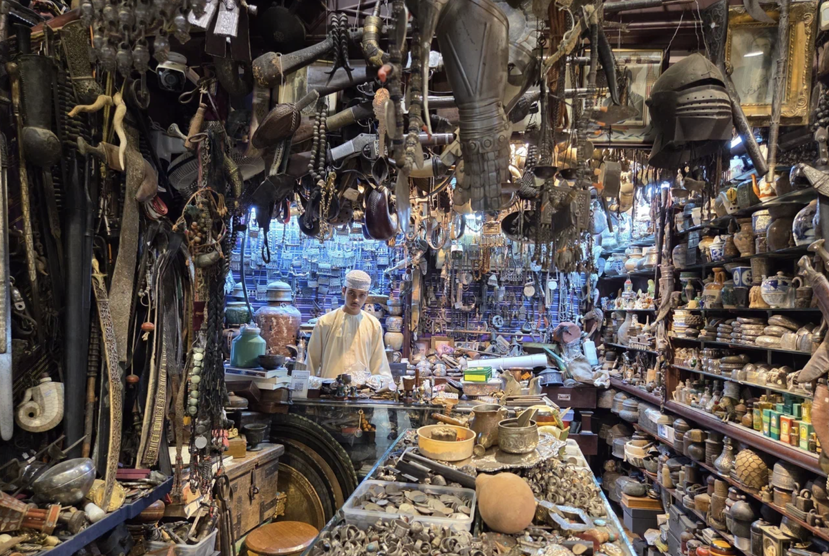 Если хочется оказаться в сказке, то вам - сюда! Выглядит она как портал в прошлое. Кажется, что здесь хранятся сокровища Си-Сима, ну или хотя бы лампа Алладина! Возможно, это она и есть! А может, вот эти - традиционные разноцветные арабские: Разные штучки, которые раньше были необходимы - например, весы, а сейчас они стали антиквариатом. Хотя глобус мог бы вполне пригодиться: Куча глобусов, один другого краше: Смешные фигурки: А здесь - ну надо же - ёлка! Но в Омане не празднуют Новый год, да и ёлки здесь не растут. Что же это может быть, если не новогодняя ёлка? Телефон с набором для диска. Интересно, современная молодежь поняла бы, как им пользоваться? Куча сережек! Говорят, что серебряные, но мало ли что говорят... Яркая разноцветная керамика: Множество сосудов с узким длинным горлышком: Амбарные замки - тоже уже далекое прошлое: Традиционные деревянные окна резные окна Омана. Конечно, исторически это интересно, но вот где их применить? бубенчики, вероятно для скота: Огромное