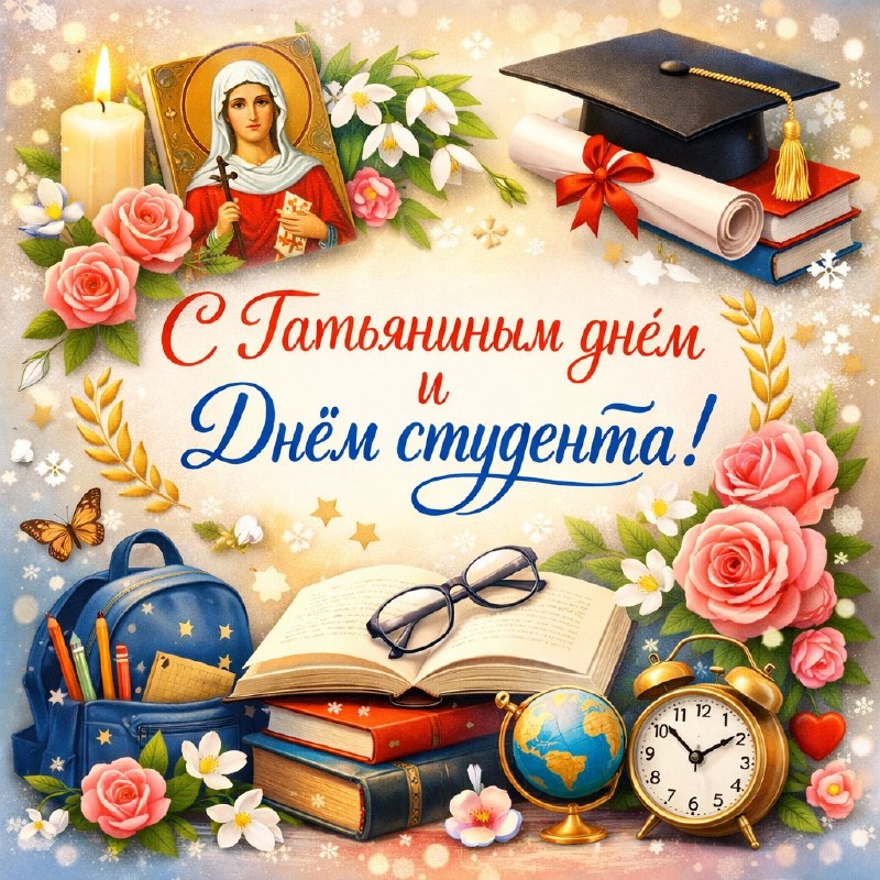 Дорогая Татьяна! В этот двойной праздник, когда святая покровительница смотрит на тебя с иконы, а дух студенчества витает в воздухе, желаю тебе идеального баланса. Чтобы святость помогала избегать искушений вроде «прогулять пару», а студенческая хитрость — с блеском выкручиваться из ситуаций, когда ты это искушение уже не избежала. Пусть твоя зачётка будет полна «автоматов», а жизненный путь — светлых и весёлых моментов!