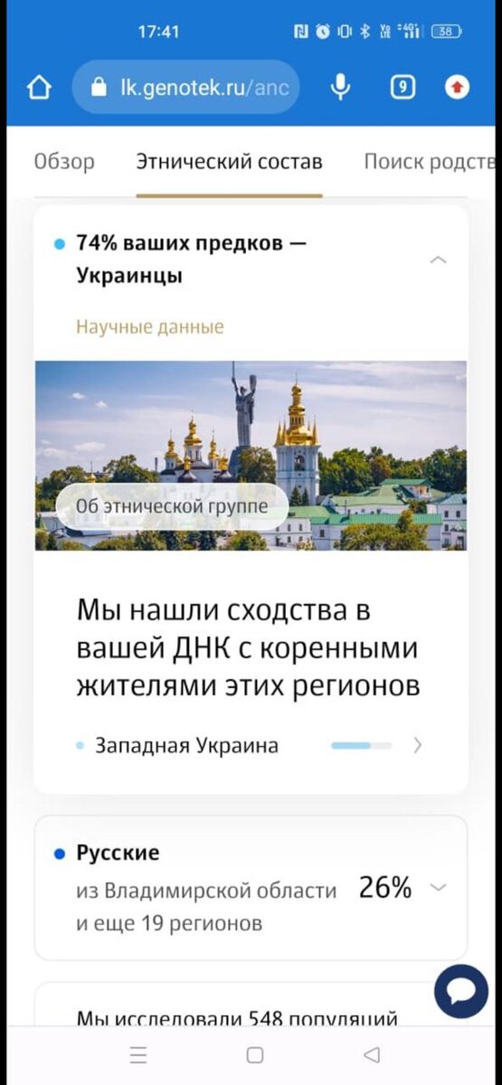 Моей дочери и племяннице деньги видать девать некуда и решили они проверить свой генетический код. Результаты пришли очень забавные. У моей Елены преобладают западенские гены, хотя в роду из Западной Украины никого не было, насколько мне известно. Дед её- мой отец родился в Черкассах, это Центральная Украина. А у дочери моего родного брата вообще украинских генов не оказалось, у неё сибиряки откуда-то нарисовались, хотя, я не припомню, чтобы кто-то мне рассказывал про сибирскую родню. Чушь какая-то эта генетическая экспертиза, как мне видится, но на самом деле тема интересная. Родословная и корни я имею в виду. Лично у меня, об этом представления самые туманные. Конечно дворянские рода отслеживают свои корни, но простые люди ведь тоже не с Луны свалились, их тоже кто-то родил и где-то родил. И вот, сейчас я очень сожалею, что не разузнала у своих бабушек об их бабушках и дедушках, сейчас задумаешься откуда твои корни, а спросить уже не у кого. И внукам, правнукам рассказать нечего. Х