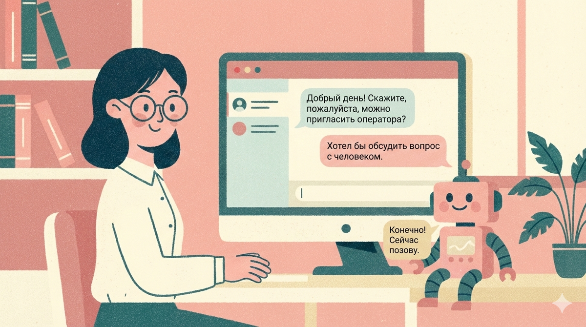 Здравствуйте! Часто на сайтах магазинов или в приложениях сначала с вами общается бот (нейросеть), а не человек. Как вежливо попросить живого специалиста? Важно: Нейросеть понимает ключевые слова. Нужно чётко попросить и объяснить причину. Лучшие фразы: Вежливая и простая: