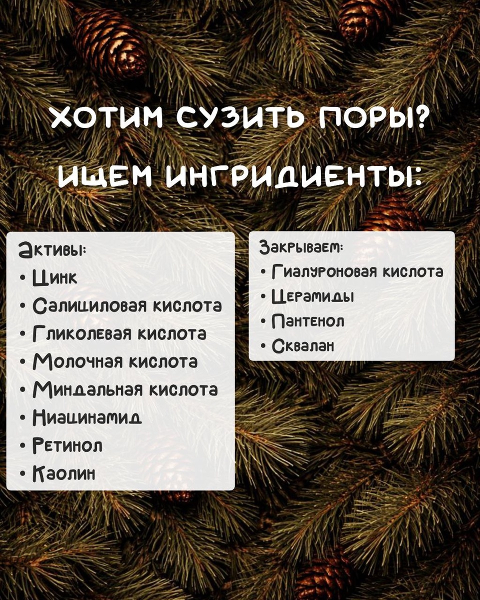 Сразу скажу, одна маска, на которой написано «для сужения пор» не поможет Не забываем про регулярность, а я уже учла баланс компонентов. Если вы новичок в кислотах или ретиноле, пожалуйста, начинайте с 1 раза в неделю Недельный план ухода. Утро: 1. Очищение: мягкая пенка или гель для умывания с кислотами (салициловая, миндальная) или цинком. Например: пенка Invit с ниацинамидом 12% и цинком 1%, настоящая звезда вашего утра 2. Тонизация: лосьон или тоник с ниацинамидом. Например: тоник Mixit, успокаивающий и подготавливающий этап 3. Сыворотка: лучше всего подойдёт легкая увлажняющая сыворотка с гиалуроновой кислотой. Например: сыворотка True Alchemist с ниацинамидом 11% и цинком. В этом дне она будет главным активом 4. Увлажнение: нежирный, некомедогенный флюид или гель-крем. Например: крем 1753 cosmetics, хорош на зиму, и есть SPF Вечером: 1. Первое очищение (если был макияж/СПФ): мицеллярная вода или гидрофильное масло/бальзам. Например: гидрофильное масло Maskoholic, оно подойдёт