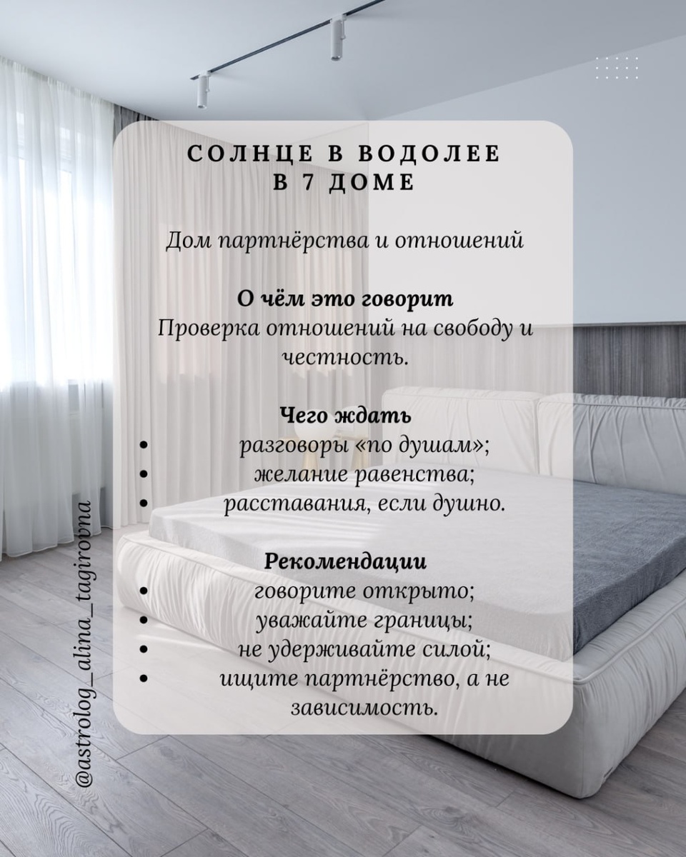 Транзит Солнца по Водолею высвечивает ту сферу, где вам пора освободиться, обновиться и выйти на новый уровень. Ориентируйтесь по натальному дому Водолея (по дате, времени и месту рождения). Если вы пока не знаете, в каком доме вашей натальной карты находится знак Водолея, или не умеете это определить самостоятельно — напишите в комментариях свои данные (дату, время и место рождения). Я посмотрю вашу карту и обязательно подскажу, где идёт транзит Солнца именно у вас. *Контент содержит личное мнение автора. АстроПсихолог Алина Тагировна #ежемесячные_астротенденции #Солнце_в_Водолее #рекомендации #прогноз ❤️