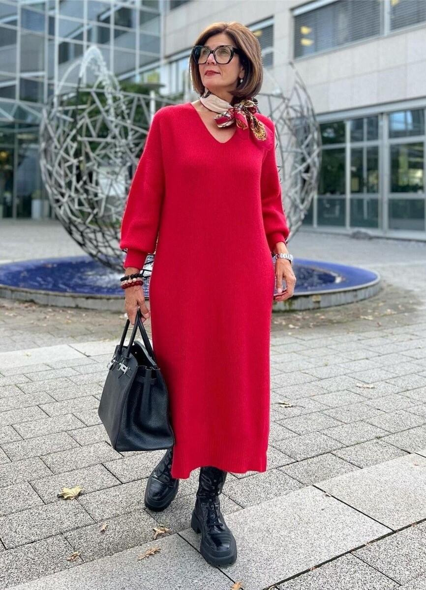Трикотажные платья способны и украсить, и омолодить, и утеплить женщин 50-60 лет. Такие вещи хорошо выглядят сами по себе и так же хорошо вписываются в многослойные образы, кроме того они могут быть лаконичными по крою или иметь оригинальный дизайн. В любом случае, трикотажные платья – одежда, заслуживающая внимания и способная часть значимой частью стильного гардероба. 1. Яркое малиновое трикотажное платье с длинными свободными рукавами и достаточно глубоким V-образным вырезом – оригинальная модель, которая особенно хорошо смотрится в стильном городском образе с контрастными деталями, например, с черными ботинками на шнуровке и «тракторной подошве» и с черной объемной сумкой. Гармоничным дополнением наряда также будут цветной браслет и пестрый шейный платок, повязанный красивым пышным узлом. 2. Лаконичное темно-серое платье-макси с вырезом-лодочкой, длинными рукавами и с карманами в боковом шве выглядит сдержанно, элегантно и стильно. Рукава платья можно немного поддернуть, чтобы откр