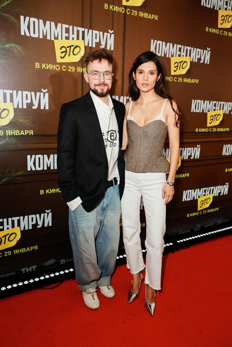 ". Первым на красной дорожке появился Сергей Бурунов в простых черных брюках и рубашке. Он шутил с журналистами и тепло обнял партнера Александра Петрова. Тот пришел с женой Викторией, и пара не скрывала нежности, целуясь на виду у всех. Петров выбрал светлые джинсы с черным пиджаком, а Виктория блистала в белых джинсах и корсете. Со сцены актер пожелал всем больше любви и признался: "Викуля, я тебя очень люблю! И маму, и тещу, и Бурунова". Его экранная жена Юлия Хлынина удивила черной юбкой и кожаной водолазкой с длинными рукавами. В фильме снялся и бывший жених Хлыниной Егор Корешков — они расстались, но остались друзьями и спокойно работают вместе. Роль комментатора исполнил Тихон Жизневский с супругой. Фильм о паре на грани развода, которая соглашается на эксперимент с "озвучкой" мыслей. Прокат стартует 29 января, гости уже ждут.
