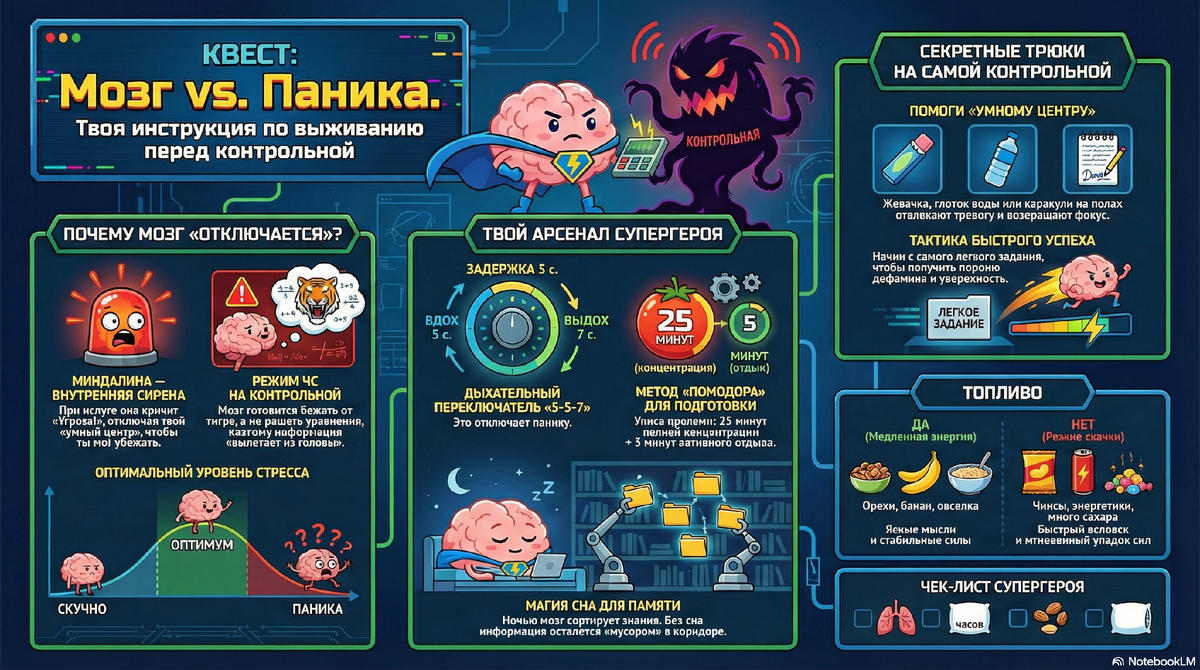 Тревога! Внимание всем ученикам! Наши главные оперативные данные показывают, что в ближайшее время ожидается атака на ваше спокойствие. Кодовое имя угрозы — «КОНТРОЛЬНАЯ». Но у нас есть секретное оружие. Это не шпаргалка. Это — понимание вашего собственного мозга. Сегодня мы запускаем спецпрограмму по подготовке агентов спокойствия.