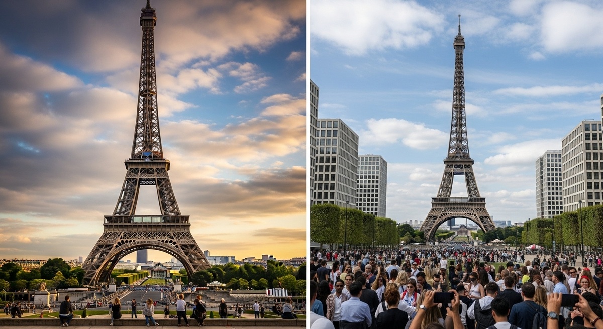 Парадокс Эйфелевой башни: фото получаются красивые. Опыт посещения разочаровывает. Ты снимаешь башню, обрабатываешь фото, выглядит потрясающе. Друзья завидуют. А ты помнишь три часа в очереди, толпу, холод на вершине.