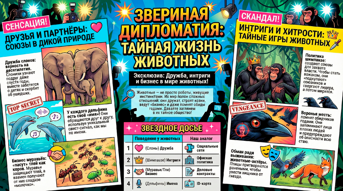 Давайте на чистоту. Когда вы слышите «поведение животных», что представляете? Скучную схему: поел — поспал — побежал от хищника. А вот и нет! Учёные, заглянув в их мир, остолбенели. Оказалось, там есть всё, что есть в нашем, и даже больше: политические заговоры, многолетняя дружба, долгая память на обиды и сложные бизнес-договоры. Так что забываем про старые учебники — сегодня мы читаем захватывающий роман под названием «Жизнь дикой природы»!