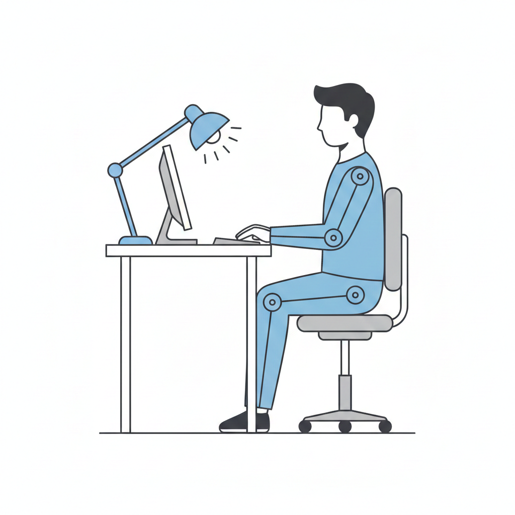 Освещение: экран не должен быть ярче комнаты, избегайте бликов. Поза: сидите прямо, экран на расстоянии вытянутой руки. Моргайте consciously — упражнения помогают восстановить слезную пленку.