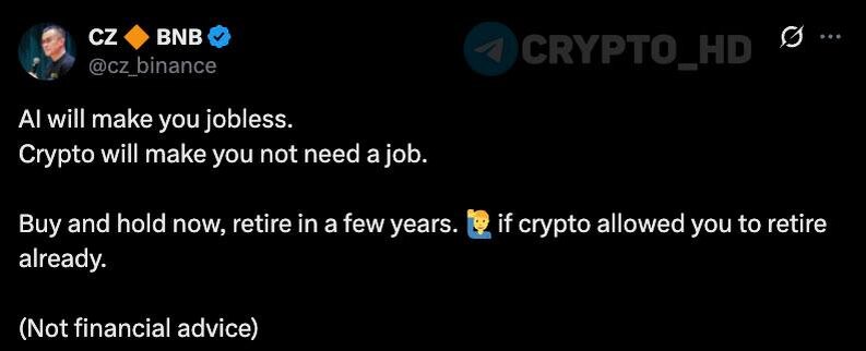 «AI оставит вас без работы. Криптовалюта сделает так, что работа вам не понадобится. Покупайте и держите сейчас, уходите на пенсию через несколько лет – если вы еще не ушли на пенсию благодаря крипте. (Не является финансовым советом)». Crypto Headlines