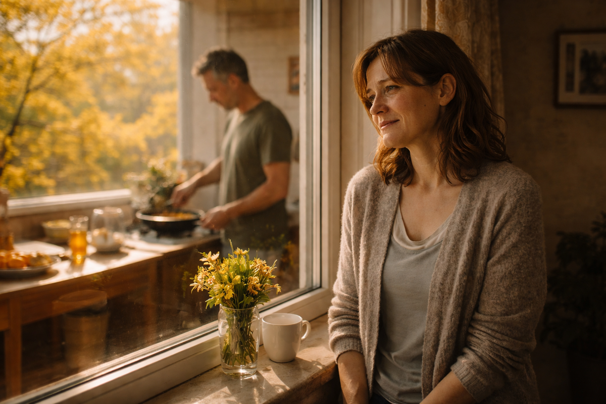 Она думала о том, что год назад стояла у этого же окна и не знала, как жить дальше. Муж ушёл, мать душила, будущее казалось тупиком.