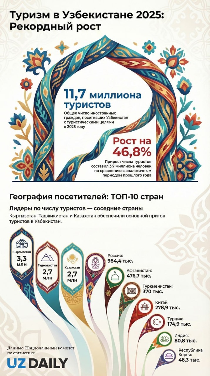 Инфографика: В 2025 году Узбекистан посетили 11,7 млн иностранных туристов, что стало заметным ростом по сравнению с предыдущим годом, свидетельствуют предварительные данные Национального комитета по статистике.
