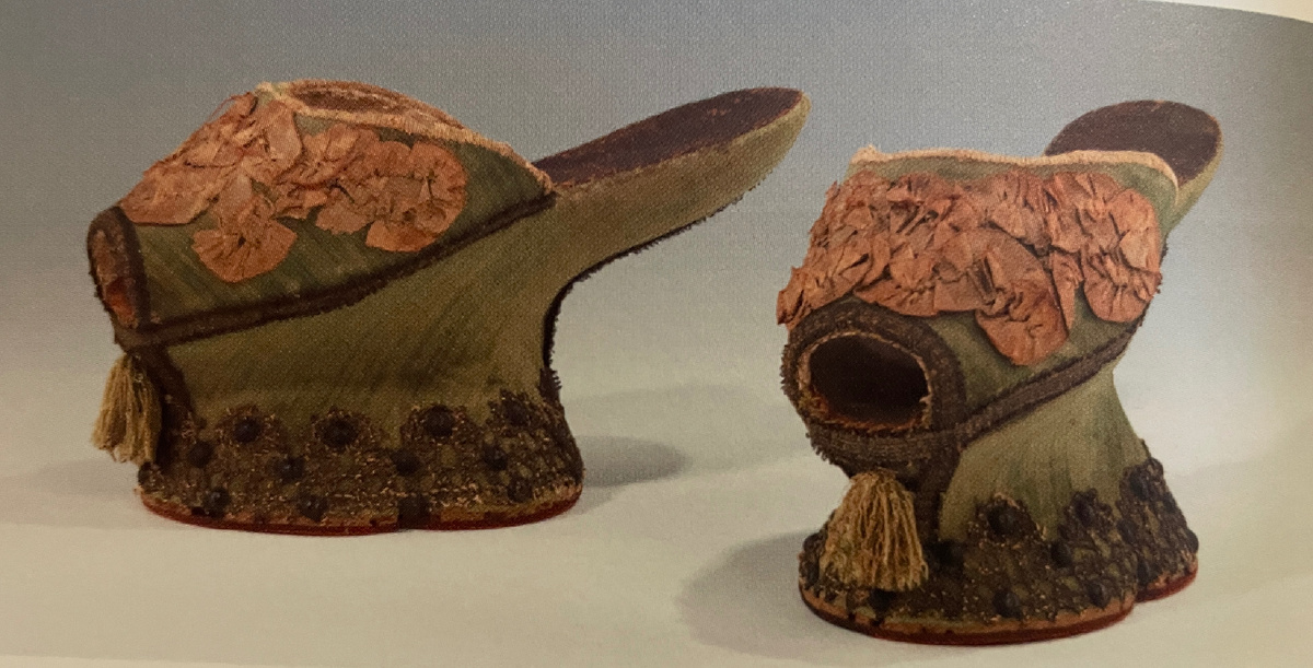 Другой пример из Венеции. Там еще в 15 веке аристократки (и куртизанки) носили чопины (цокколе, пьянелли) - туфли на платформе и каблуке, высота которых достигала 50 см (!!!). Без помощи служанок женщина не могла перемещаться в такой обуви, но что только не сделаешь ради красоты: трактаты по этикету того времени заверяли, что при усердии и практике женщина может научиться грациозно двигаться и даже танцевать в такой обуви. Видео тех времен с научившимися не сохранилось, к сожалению. Но сохранился закон 1430 года, который ограничивал в Венеции высоту каблуков чопинов до 3 дюймов (7,62 мм). Однако судя по всему закон этот массово игнорировали, а чопины на высоченных каблуках носили в в Венеции (и еще кое где в Испании) до 17 века. На картинке чопины по закону.