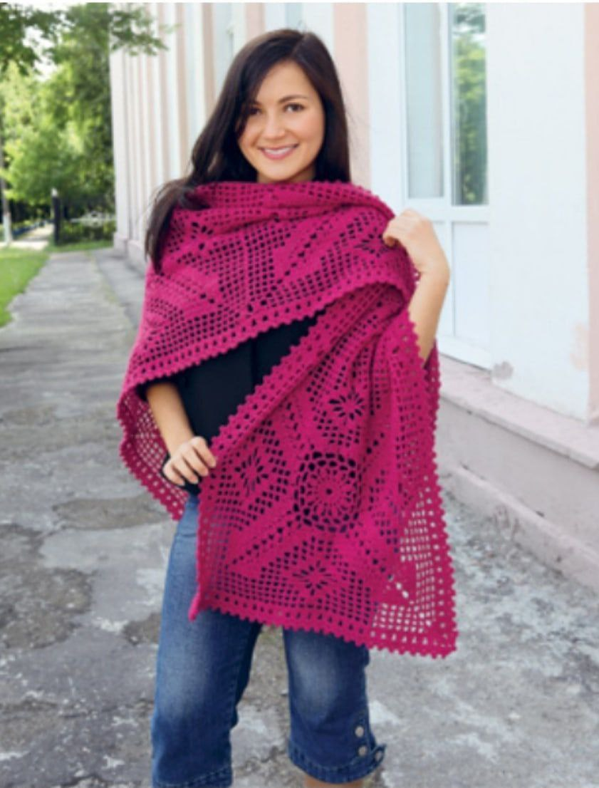 Ажурный палантин крючком идеален для весны и осени — лёгкий, тёплый, драпируется красивыми складками.