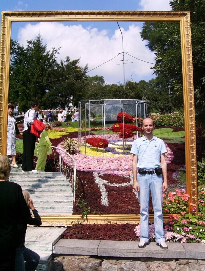 ПРО ФОТО: за стенами Лавры на Певческом поле не только грохотали концерты (изобретение советской власти, хотя монашеской жизни там до 1988 года и не было, некому было мешать кроме как Аархитектуре, Паамятникам (все в перечне ЮНЕСКО), ну чтобы пошли трещинами. В 88-м году к 1000-летию Крещения Руси Раиса Горбачёва приехала и 1/20 часть Лавры вернула РПЦ, а имено - её такой части как УПЦ, подробности про это и про концерты писали. Будущий Митрополит Киевский, Управделами РПЦ и возглавлял Госкомиссию по Чествованию в СССР такого Юбилея. Аквариум в спецслужбах начал понимать, что что-то не по плану с Союзом Нерушимым, вот вспомнил о Боге, может поможет и козни Глубинного государства не разрушат Союз, писали, что оно задействовало для этого), но и ежегодно "Главная в Украине Выставка цветов" там проходила. Так как я был уже немного по цветам, то в первый год моей жизни в Лавре вышел посмотреть. Вряд ли один, возможно предложил кто-то из семинаристов (что-то есть в памяти, но не точно, может кто помнит), из тех, кто тогда работал на территории в Резиденции Митрополита. Тогда ещё не был ни его садовником, ни его дворником, был помощником-водителем матушки Валентины, его правой руки, главной по финансово-хозяйственным делам, все подробности писали, в том числе, как я там оказался. Что у меня на снимке со штанами, не помню, вряд ли кто дал поносить, видимо только что купил и не успел в ателье укоротить. А других летних видимо не было. К тому же по ширине большие. Видимо на скорую руку куплены среди того, что продавалось неподалёку. А модную дорогую тенниску мне брат подарил, он её купил себе, но дома оказалось, что маловата. На кадре портит снимок столб с проводом, но сейчас технологии это быстро устраняют. За деревьями видны купол и крест, в 10 метрах от этого храма я и жил. Скрин про время и дату съёмки - в папке "Про другое", ссылка на Таплинке. Лет 10 назад, то есть в самом начале знакомства с Виртуальным пространством и публикации там, публиковали заметки со снимками с этой Выставки, но без меня на кадрах. Вот добрались и до меня. Писали, как так вышло. На всё Воля Бога, Им и Его Слову Слава. Он Разум как нетрудно заметить. Причина всякого появления, преображения и созидания не Всевысший коллективный разум? Пресвятая Троица, Пречистая Богородица, святые и ангелы, у ног Ваших. Любим и Вас, Средства Общины Христа. Этот аквариум на снимке есть и без меня на кадре, можно найти. Кому как надо. Вообще-то это цветочная композиция называется "Картина, на которой люди разглядывают аквариум с рыбками и убранством, сделанными из живых цветов". Все композиции там делались неделю, а после открытия должны были в хорошем виде простоять ещё неделю. И это в конце августа, то есть частенько в зной, не только в жару, каждый год разное. Был там раз и хватит, был впечатлён, снимков много наделал, с десяток потому и опубликовал в самом начале. В остальные 8 лет меня приглашали не раз, но у меня были дела в келии, писал, когда все отдыхали, трудился и под грохот концертов, которые к слову тоже нравились, не мешали. За стену ни разу не выглядывал, чтобы посмотреть, хотя это был лучший и бесплатный вид на эти зрелища. А вот салюты снимал из-за стены, в том числе через её бойницы, она вся оборонительная, построена царём Мазепой, ни от каких захватов не спасла, как и его не спасла от лукавого его так сказать служба Бо