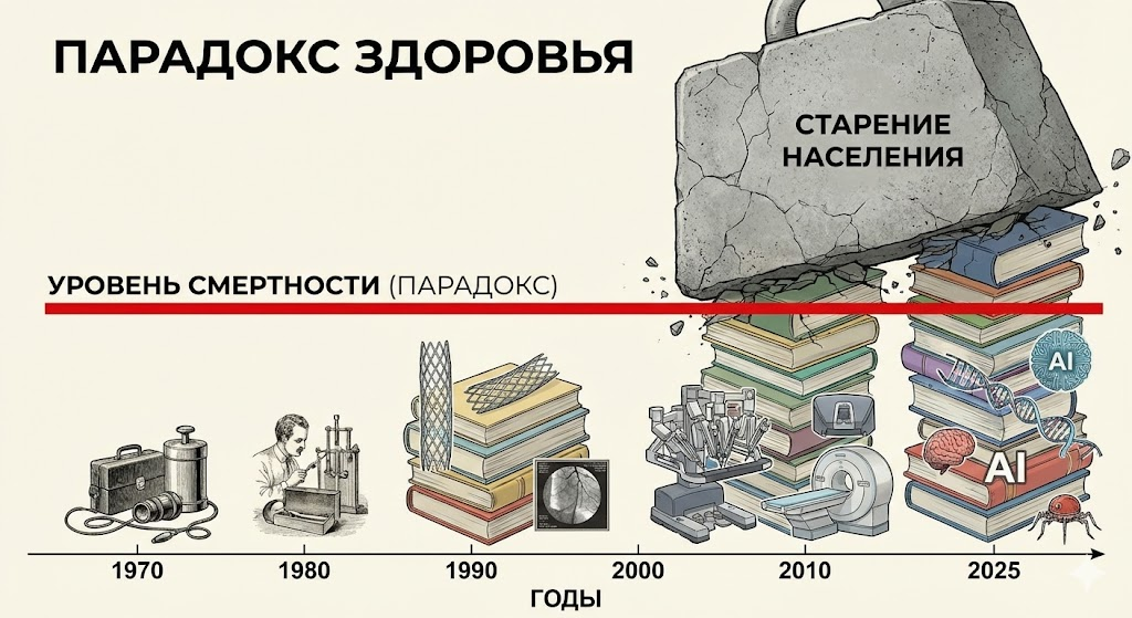Первая тема — парадоксы современной медицины и пациенты, которые сами себе враги. У нас есть стенты, микрохирургия, шунты и роботы. Технологии шагнули в космос, но статистика неумолима: смертность от сердечно-сосудистых заболеваний за полвека не снизилась.