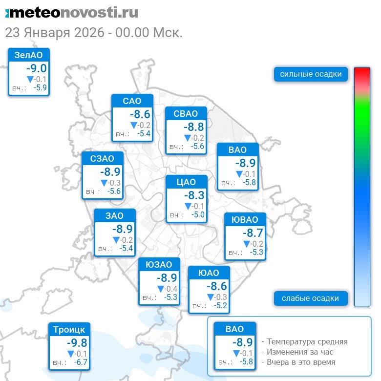 В 0:00 в Москве было от -9.9°C до -7.9°C, средняя температура -8.7°C #погода #Москва #зима #температура #23января #пятница