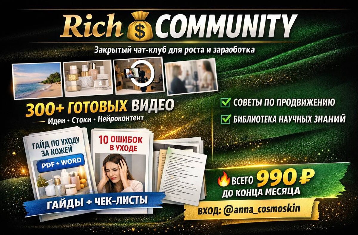 Закрытый чат-клуб для роста, денег и сильного контента Это не просто чат. Это готовая система, которая помогла мне набрать +95 000 подписчиков за 3 месяца (инстаграм,тик ток, ютуб)— и теперь доступна тебе. 🔥 Что ты получаешь внутри 🎥 300+ готовых авторских видео — бери и выкладывай сразу — или используй как идеи для своего контента 🎞 Стоковые видео для Reels / Shorts / TikTok — экономия времени — профессиональный визуал без съёмок 🤖 Нейро-контент + авторские креативы — цепляет — удерживает внимание — повышает охваты 🚀 Рабочие советы по продвижению — что реально заходит сейчас — без воды и устаревших схем 🎬 Всё про визуал и продажи Съёмка • монтаж • обработка • упаковка • продажи 📚 Авторские гайды и чек-листы (ценность, которую можно использовать и зарабатывать с ней) ✔ «Гайд по уходу за кожей» ✔ «10 ошибок в уходе за кожей» ✔ «Гайд по осложнениям» (для практикующих косметологов) ✔ «Полное руководство по уходу за кожей дома» ✔ «300 шаблонов заголовков» ✔ «Гайд по самомассажу»