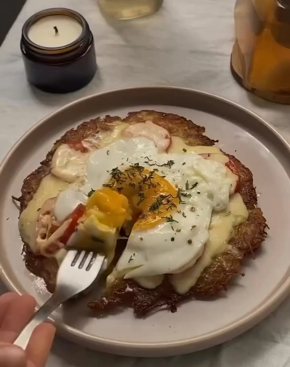 Вкусный и сытный завтрак 🍳 📌 Ингредиенты: Картофель - 3 шт Мука - 1 ст.л Помидор - 1 шт Твёрдый сыр - 30 гр Яйцо - 1 шт Соль, перец (по вкусу) Растительное масло (для жарки) Зелень (для подачи) Приготовление: 1. Картофель очищаем и натираем на крупной тёрке. 2. Добавляем к картофелю муку, солим и перчим по вкусу. Хорошо перемешиваем. 3. На сковороде, смазанной растительным маслом, формируем из картофеля лепёшку и обжариваем с двух сторон. 4. Посыпаем лепешку тёртым сыром, выкладываем нарезанные помидоры, накрываем крышкой и готовим буквально 3 минуты. 5. Выкладываем лепёшку на тарелку, сверху кладём предварительно поджаренное яйцо и посыпаем зеленью.