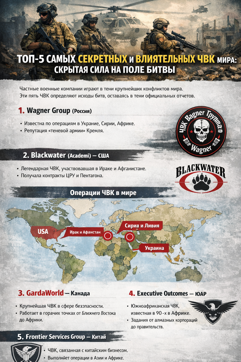 Частные военные компании действуют за кулисами крупнейших конфликтов мира. Они влияют на исход сражений, оставаясь в тени официальных отчётов. Мы собрали пятерку самых известных и секретных ЧВК, чья сила ощущается далеко за пределами их стран. Заключение: