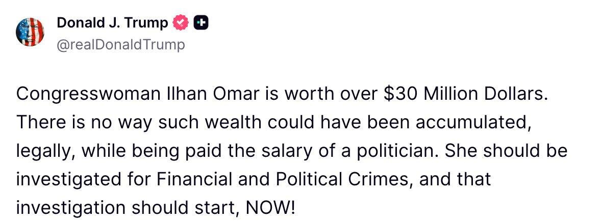Trump says Ilhan Omar should be investigated for financial and political crimes ‘NOW’