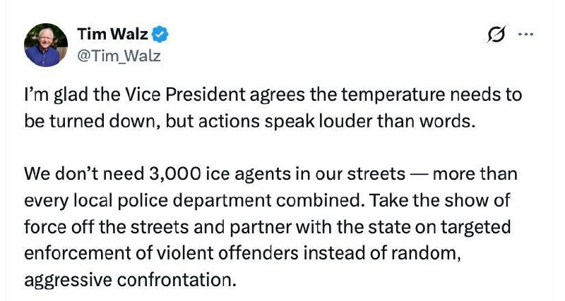 Tim Walz says he agrees with Vance about needing to turn the ‘temperature’ down in Minnesota, after saying he wants the ‘occupation’ by ICE to end