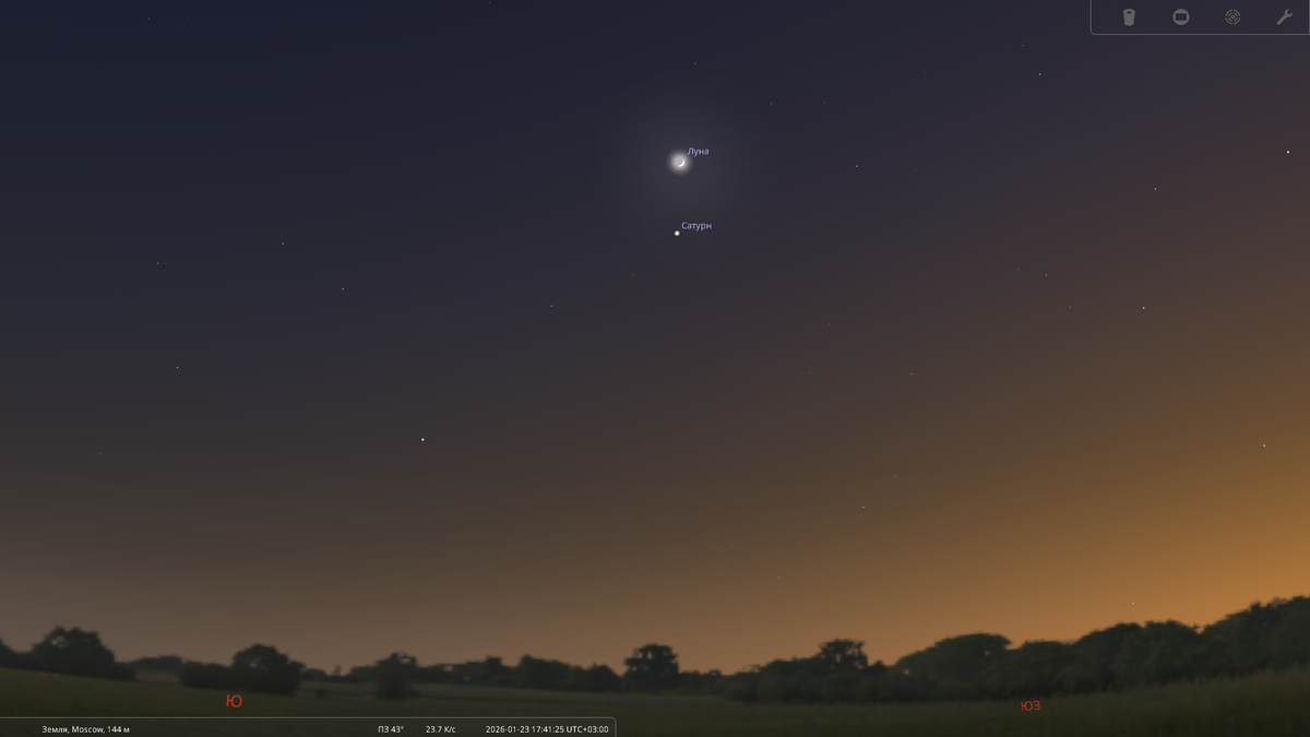 Вечером 23 января 2026 над юго-западным сектором горизонта встретятся Сатурн, Нептун и молодая Луна. Сатурн и Нептун на небе рядом по меньшей мере год. И еще столько же будут находиться поблизости друг от друга. А потом разойдутся - более быстрый Сатурн обгонит далекий Нептун. Но до этого пока еще далеко. Луна навещает обе эти планеты ежемесячно. В этот раз она пройдет в 3,5 градусах к северу от Сатурна. Нептун окажется примерно посередине между Сатурном и Луной. Лунный серп не слишком яркий, и не помешает отыскать неприметный Нептун в сильный бинокль или телескоп. Но поисковые карты вам точно понадобятся. Хотя можно воспользоваться и теми скриншотами из программы Stellarium, которые я прикрепил к этой публикации.