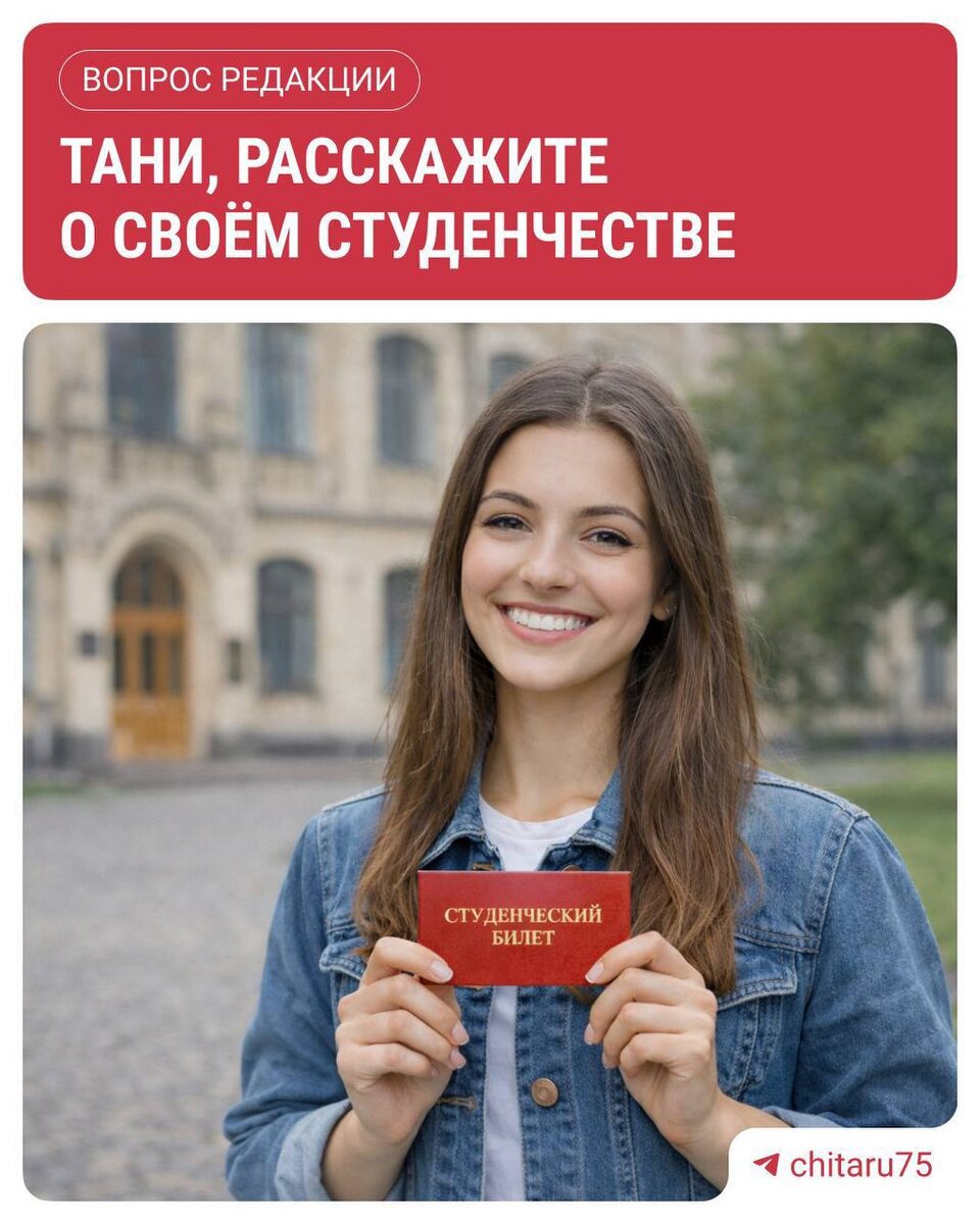 Тани, в преддверии Татьяниного дня и Дня студента предлагаем вспомнить, каким оно было у вас — с радостями, открытиями и важными моментами. Присылайте фото и небольшой рассказ в бот с отметкой #историяТани. Ждём их сегодня до 17:00. 🟦 Новости Читы и Забайкалья