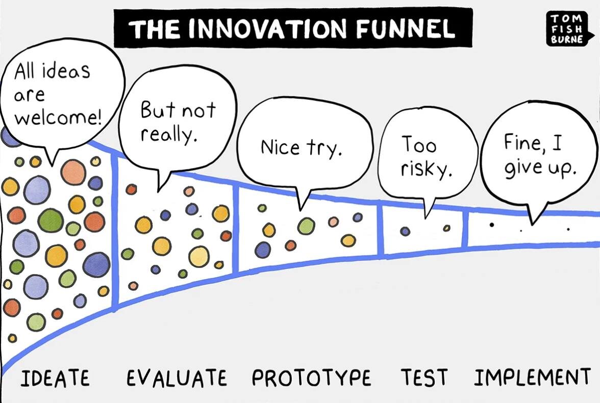 Многие компании используют «воронку инноваций»: много идей на входе, несколько запусков на выходе. Кажется логично? Но эта система даёт сбой. Она отбирает не самые сильные идеи, а самые безопасные. Что не так с воронкой? 🔄 Процесс как блендер: Проходя через отделы и согласования, идею «подрезают», «шлифуют» и «оптимизируют». К финалу от первоначальной задумки часто ничего не остаётся. ⚖️ Культура риска: Организации отлично видят угрозы, но плохо — возможности. Путь наименьшего сопротивления — играть безопасно. Итог: «убийство» смелости на корню. 🧩 Мышление в «коробочках»: Когда над идеей работает не сплочённая команда, а обособленные отделы, они сглаживают все острые углы — ту самую уникальность, ради которой всё затевалось. К чему это приводит? К посредственности. К параду «клонов», мелких улучшений и новых версий старого. Вы не прорвётесь сквозь шум рынка, просто добавив к нему ещё немного такого же. Что делать? 1. Защищайте суть. В каждом обсуждении задавайтесь вопросом: «Со