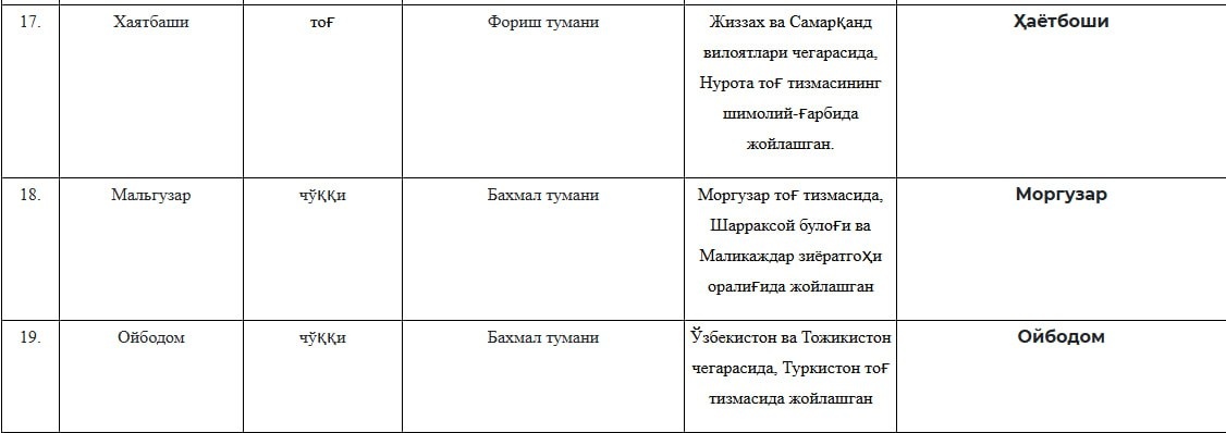 Ўзбекистон Республикаси Вазирлар Маҳкамасининг "Мамлакатимиздаги айрим географик объектларнинг номларини давлат тили қоида ва меъёрларига мувофиқлаштириш ҳамда янги ном бериш тўғрисида"ги 4- сонли қарорига мувофиқ 121 та тоғ тизмаси, тоғ ва чўққилар номлари давлат тили қоидаларига мувофиқлаштирилди ва расмий тасдиқланди. Унга кўра Жиззах вилояти ҳудудидаги тоғ тизмалари ва чўққиларнинг янги номлари билан танишинг. Эндиликда мазкур объектлар ушбу номлар билан аталиши тавсия этилади. 👆🏻 Каналимизга обуна бўлинг ва энг сўнгги янгиликларни кузатиб боринг Jizzaxnews |Тelegram | Facebook | Dzen | YouTubе