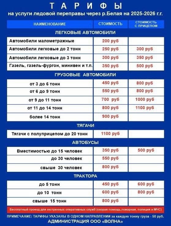 Тарифы на услуги ледовой переправу через р. Белая