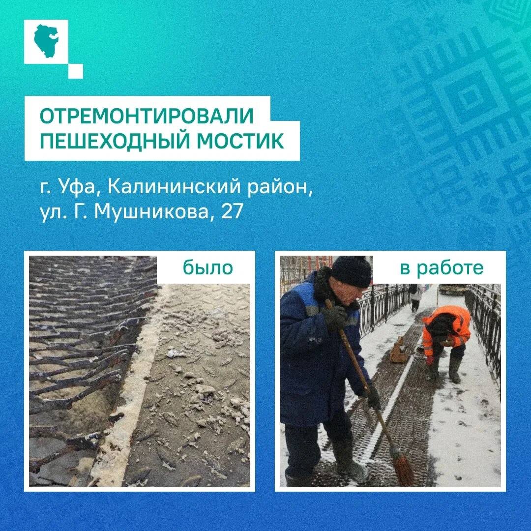😀😃😄😁 В Уфе по улице Георгия Мушникова возле дома №27 отремонтировали пешеходный мостик. Сообщение о том, что его нужно починить, 19 января 2026 года в соцсети написали местные жители – ЦУР Башкортостана зафиксировал обращение. Решением проблемы занялись коллеги из администрации Калининского района. Сотрудники МБУ «СУРСИС» на следующий день, 20 января пешеходный мостик привели в порядок. 💚 ЦУР Башкортостана